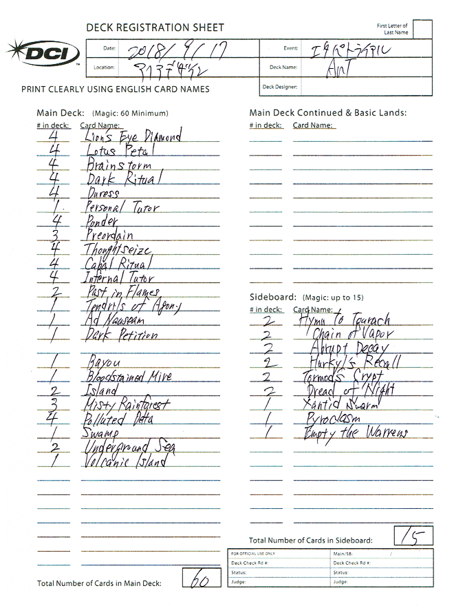 4 《渦まく知識/Brainstorm》 1 《対抗呪文/Counterspell》 4 《意志の力/Force of Will》 1 《呪文貫き/Spell Pierce》 4 《剣を鍬に/Swords to Plowshares》 1 《議会の採決/Council’s Judgment》 1 《コジレックの審問/Inquisition of Kozilek》 2 《未練ある魂/Lingering Souls》 2 《思案/Ponder》 1 《至高の評決/Supreme Verdict》 3 《思考囲い/Thoughtseize》 1 《殴打頭蓋/Batterskull》 1 《仕組まれた爆薬/Engineered Explosives》 1 《梅澤の十手/Umezawa’s Jitte》 2 《精神を刻む者、ジェイス/Jace, the Mind Sculptor》 -呪文(29)- |